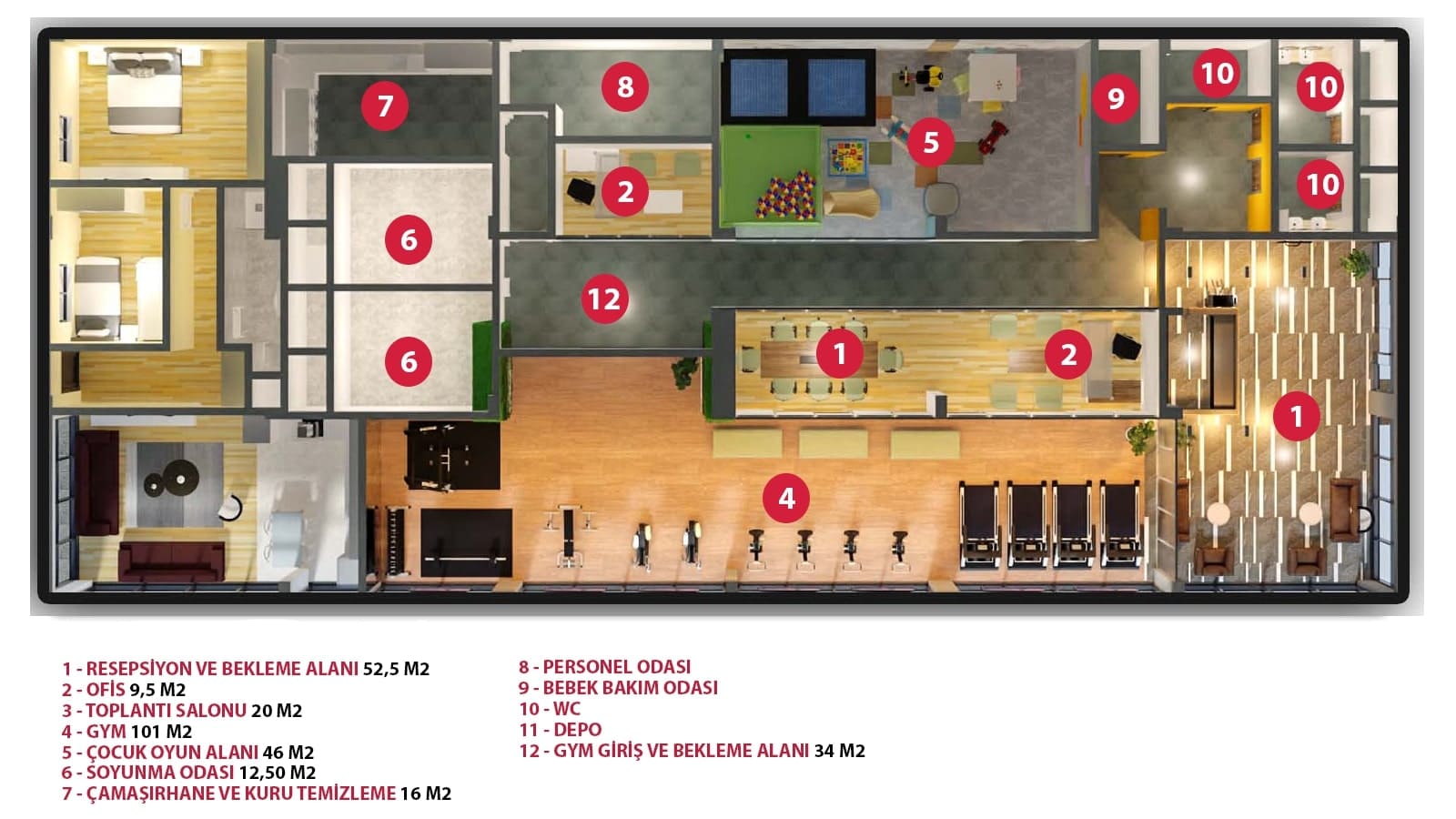 На территории в 27800 м2 расположено 24 пятиэтажных блока, летний бассейн, зимний бассейн, фитнес центр, финская сауна, хамам, зона отдыха, сад, детская площадка, зона барбекю, wi fi, система видеонаблюдения, спутниковое ТВ, охрана 7/24, электрогенератор, крытая парковка.